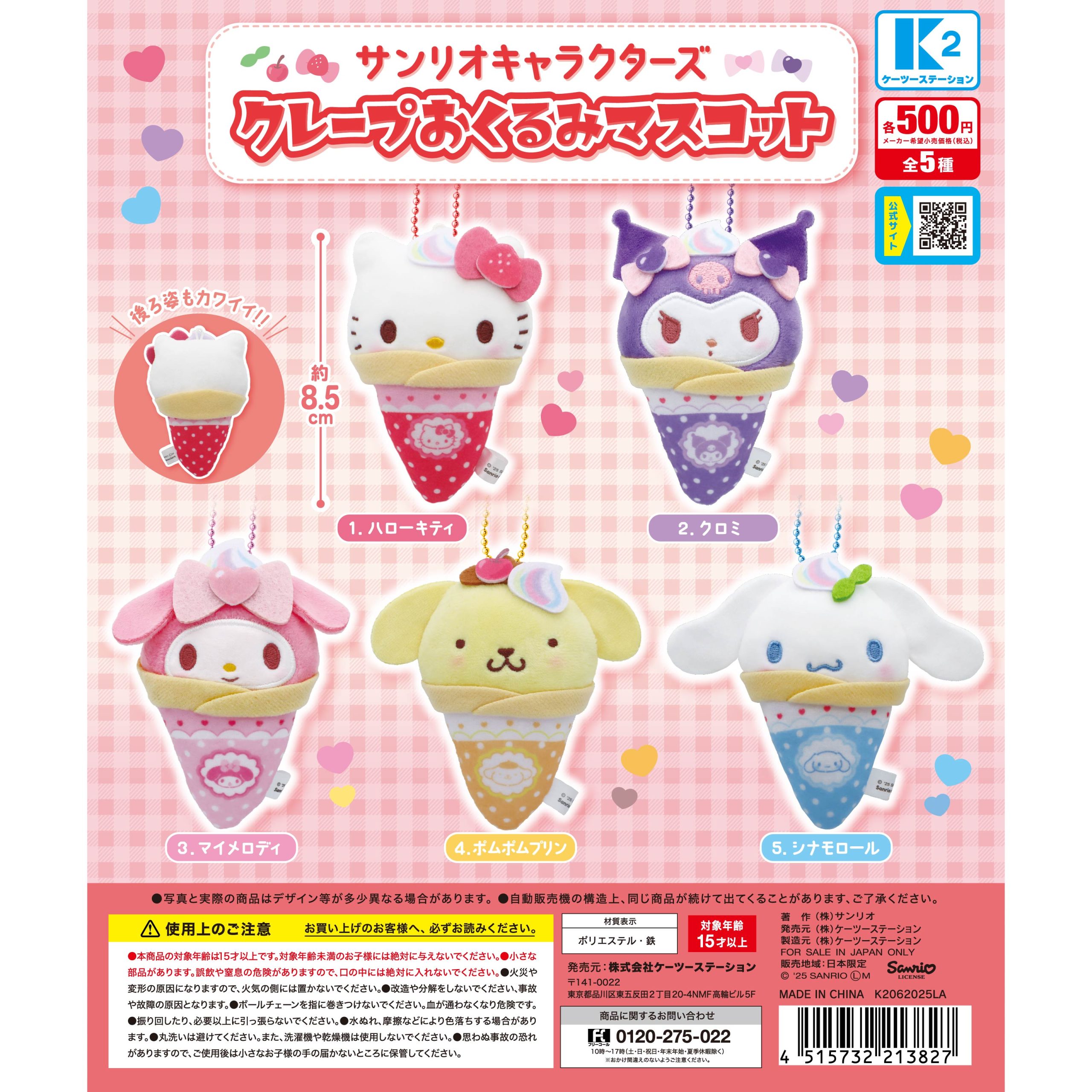 サンリオキャラクターズ クレープおくるみマスコット 2026年3月4日 最終更新日時 : 2026年3月4日 editer@k2st サンリオキャラクターたちがクレープ生地にくるまれちゃった!人気のおくるみシリーズ第2弾が登場! 【ラインナップ】ハローキティ・クロミ・マイメロディ・ポムポムプリン・シナモロール sanrio_crepe_daishisanrio_crepe_1sanrio_crepe_2sanrio_crepe_web_3sanrio_crepe_4sanrio_crepe_5 発売日2025年6月価格(税込)500円種類数5種JANコード4515732213827本体サイズ全長約85mm カプセル68mm対象年齢15歳以上製品素材ポリエステル・鉄 ※写真と実際の商品はデザイン等が多少異なる場合がこざいます。※予告なく発売日は変更になる場合がこざいますので予めこ了承ください。 X Instagram